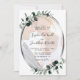 Eucalyptus Photo Silver Metallic All in One Faire-part de mariage... Notre faire-part de mariage photo "All in One" présente un cadre argenté ovale métallique orné de feuilles d'eucalyptus sauge et vert émeraude bordant une photo de la mariée et du marié sur un arrière - plan blanc immaculé. Votre photo sera placée sur un calque sous une transparence blanche pour "fondre" les couleurs un peu afin que le texte sur le dessus soit lisible. Le verso de l'invitation contient tous les détails que vous verriez généralement sur des cartes séparées dans le paquet mariage. Il y a également un modèle graphique de code QR que vous pouvez remplacer par votre propre code simplement en entrant votre URL de site mariage sur le modèle de personnalisation. Votre photo, code QR et tout texte d'exemple peuvent être facilement révisés avec vos propres informations sur le même modèle.