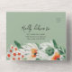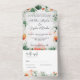 Créez la suite Mariage parfaite avec ce faire-part de mariage tout-en-un fleuri et informel avec une aquarelle romantique illustrant les fleurs sauvages verts et oranges. Modifiez facilement les champs modèles pour ajouter les noms de mariée et de mariée ainsi que les détails de votre date et de votre emplacement dans des polices de calligraphie noire élégantes et distinguées.