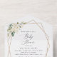 Invitations amis et famille dans le style et donner le ton pour votre journée spéciale avec cette charmante invitation baby shower. Le design présente des fleurs d'aquarelle blanche, de la verdure et un cadre doré sur un arrière - plan blanc.