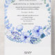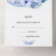 Un faire-part de mariage rustique fleuri bleu pratique (sans parler de très élégant) avec RSVP inclus. La décoration est composée d'une belle et grande couronne d'aquarelle en bleu avec de jolies fleurs bleues, des baies feuilles et bleues qui ornent la couronne au fond.