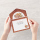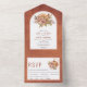 Les fleurs en terre cuite et le citrouille tombent en un seul faire-part de mariage. Ce joli design mariage dispose d'un cadre en arc sur arrière - plan taché en terre cuite et la carte RSVP détachable détachable arrachable. Dans le cadre il y a un bouquet de fleurs en terre cuite et un citrouille.
