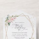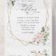 Invitations amis et famille dans le style et donner le ton pour votre journée spéciale avec ce faire-part de mariage charmant. Le design présente des fleurs d'aquarelle rose et blanche, de la verdure, des confettis dorés et un cadre doré sur un arrière - plan blanc.