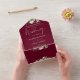 Le tout dans un seul faire-part de mariage avec le nom des parents, des feuilles botaniques de verdure rustique, et une élégante typographie blanche sur un arrière - plan bordeaux. L'invitation comprend une carte RSVP perforée avec un code QR. Conçu par Thisisnotme©