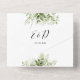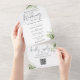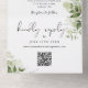 Le tout dans un seul faire-part de mariage avec le nom des parents, feuilles botaniques de verdure rustique, et typographie élégante. L'invitation comprend une carte RSVP perforée avec un code QR. Conçu par Thisisnotme©
