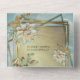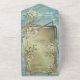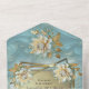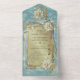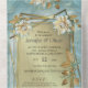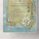 Une palette bleu clair se trouve devant un motif arrière - plan en cuivre/bronze de style barogue. Les cartes sont décorées de fleurs crème et de feuilles dorés sur un cadre en forme d'or pour votre unique invitation.