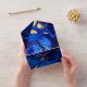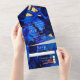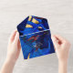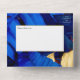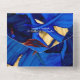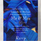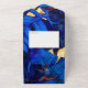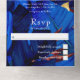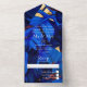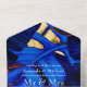 Faire-part de mariage avec un luxueux motif jungle dans les tons bleu, bordeaux et or.