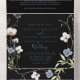 Ce mariage sauvage à fleurs noires dans une seule invitation est parfait pour un mariage rustique. Ce design présente une aquarelle peinte à la main, des fleurs de forêt sauvage blanches et bleues avec un feuillage vert dans un arrière - plan noir. Enregistrez du papier en incluant plus de détails dans l'invitation plutôt que sur une carte de boîtier séparée.