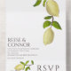 This customizable all-in-one wedding invitation has a clean and modern look. It features my illustrations of lemons on leafy branches and is ready to be customized with all of your wedding information. With a detachable RSVP card this all-in-one invite is an economical way to send out a complete wedding invitation package.
