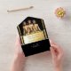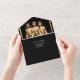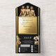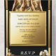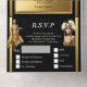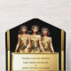 Une invitation tout-en-un luxueuse, élégante et intemporelle, avec des filles chic en effigie portant des robes d'or et des coiffures courtes et fluides, bien ajustées, ornées de coiffures et de perles fantaisistes. Ils sont fixés contre un arrière - plan noir qui a des incrustations d'or et des bordures latérales sur lesquelles des modèles noirs pour votre libellé personnalisé apparaissent. La bande de déchirure en bas est pour vos invités à rsvp et à indiquer les préférences de repas. Célébrez cette vintage vingtaine d'années rugissantes dans le style avec cette invitation sur mesure et économique.