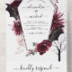 Halloween 31 Octobre Automne Automne Couleur d'eau foncée Bourgogne et Noir Mariage Invitations - comprend hantante et effrayante typographie de script élégant avec des Fleurs modernes, Araignées, Cobwebs et Bat Wings pour la célébration spéciale de mariage Déplaisant.