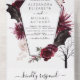 Halloween 31 Octobre Automne Automne Couleur d'eau foncée Bourgogne et Noir Mariage Invitations - comprend hantante et effrayante typographie de script élégant avec des Fleurs modernes, Araignées, Cobwebs et Bat Wings pour la célébration spéciale de mariage Déplaisant.