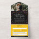 Le bonheur de toujours après la fête de mariage avec un RSVP déchiré en contraste noir et blanc avec jaune vif, corail, aqua, et rose chaud. L'invitation lit Le bonheur toujours après la fête. Design contemporain graphique audacieux, personnalisez avec votre propre salle de mariage tardif mariage après la fête, les noms des mariées et des mariées et les détails de réponse, et votre photo de mariage préférée de votre mariage sur le rabat intérieur et demandez par l'intermédiaire de votre rsvp des informations d'invité pour une chanson à jouer et les exigences alimentaires ou de modifier vos propres détails optionnels. Idéal pour les mariages reportés. Cette conception ne nécessite aucune enveloppe supplémentaire et dispose d'un RSVP perforé détachable auquel vous pouvez ajouter votre adresse de retour pour des réponses faciles. Produits mariages correspondants et autres options de couleur disponibles dans le magasin. © Conception par Sarah Trett pour www.mylittleedenweddings.com