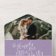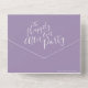 Le bonheur de toujours après la fête de mariage avec un RSVP déchiré en violet et blanc muet. Script typographique moderne simple violet sur un arrière - plan blanc design post-faire-part de mariage lit Le bonheur toujours après la fête de mariage. Design contemporain simple, personnalisez avec votre propre salle de mariage mariage tardif après la fête, les noms des mariées et des mariées et les détails de la réponse, et votre photo de mariage préférée de votre jour de mariage au verso. Idéal pour les mariages reportés. Cette conception ne nécessite aucune enveloppe supplémentaire et dispose d'un RSVP perforé amovible pour des réponses faciles. Produits mariages correspondants et autres options de couleur disponibles dans le magasin. © Conception par Sarah Trett pour www.mylittleedenweddings.com