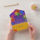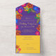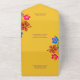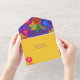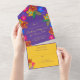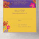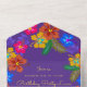 Invitation à une fête d'anniversaire luau, ou fête à thème hawaïen. Purple et or, l'invitation tout-en-un a une carte de réponse en bas qui se détachera pour les invités à retourner dans le courrier. Fleurs tropicales colorées et feuille bordent le texte modèle. Inclure les adresses à trois endroits sur l’avant, pour l’adresse du destinataire, l’adresse de retour (sur le rabat) et l’adresse postale RSVP. Les fleurs décorent l'extérieur et l'intérieur de cette invitation à la fête.