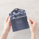 Un élégant mariage d'hiver rustique script de typographie stylisé tout en un RSVP déchirer le faire-part de mariage budget modèle sur le bois de grange bleu marine avec des flocons de neige blancs et des cordes de lumières scintillantes. +++++++++++++++++++++++++++ L'invitation est adaptée aux mariages rustiques bleus et blancs du thème des merveilles hivernales.