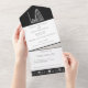 Apportez une touche de plaisir geek à votre événement avec cette carte tout-en-un et faire-part de mariage RSVP. À l'intérieur, vous trouverez un graphique blanc sur un arrière - plan noir profond au-dessus d'une section avec un exemple de texte qui peut être customisé pour votre journée spéciale. La partie inférieure de l'invitation est constituée d'une pièce amovible de taille carte postale qui contient un échantillon de texte RSVP placé au-dessus d'une bordure noire en onyx avec un motif de spirales, intégrales, Pi et graphiques Fibonacci éparpillés dans le bas. À l'extérieur, une bordure similaire de symboles mathématiques sur le noir se trouve sous les zones où vous ajouteriez des timbres, des normes et des adresses de retour pour l'invitation dans son ensemble et la section RSVP consignée. Le rabat utilisé pour plier et sceller la carte a un graphique unique sur un arrière - plan onyx profond avec un échantillon d'initiales que vous pouvez customiser pour une touche personnelle finale qui montre votre amour pour les maths et l'autre. Assurez-vous de consulter le reste de l'ensemble It Adds Up in Black pour d'autres produits de coordination, y compris les étiquettes d'adresse de retour.