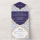 Make a bold and elegant first impression with this Indigo Moroccan Tile Wedding All in One Invitation, featuring a rich indigo background and a beautifully illustrated Moorish floral tile arch inspired by traditional arched Moroccan windows. The intricate geometric and floral detailing reflects classic Moroccan and Moorish architecture, creating a design that feels both luxurious and culturally inspired.