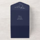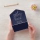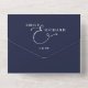 Cette faire-part de mariage minimaliste tout-en-un présente une typographie élégante sur un arrière - plan bleu marine. L'invitation comprend une carte RSVP perforée avec votre code QR du site Web mariage. Conçu par Thisisnotme©