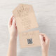 Cette faire-part de mariage minimaliste tout-en-un présente une typographie élégante sur un arrière - plan de pêche doux. L'invitation comprend une carte RSVP perforée avec votre code QR du site Web mariage. Conçu par Thisisnotme©