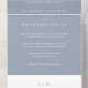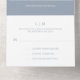 Un modèle tout-en-un unique avec carte rsvp pour une option pratique et économique pour les couples économes en budget. L'invitation moderne mais élégante présente votre monogramme à deux lettres en haut ainsi que vos détails mariages en blanc sur un arrière - plan bleu poussiéreux. Un design chic et design qui conviendra à un couple minimaliste.