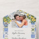 Faire-part de mariage Lemon Grove avec déchirure RSVP et votre photo. Le design se compose d'un citronnier, de tuiles méditerranéennes bleues et jaunes, d'une branche de citrons et de fleurs en fleurs. Parfait pour un thème mariage citron, mariage d'inspiration italienne, villa méditerranéenne rustique esthétique, couleurs mariage bleues et jaunes ou mariage extérieur à toute heure de l'année. Pour coordonner les invitations, la papeterie, le décor de la journée et de la table, les jeux et les panneaux de mariage, veuillez consulter ma collection de Mariages Lemon Grove ou m'envoyer un message pour ajouter tout autre élément dont vous avez besoin.