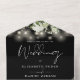 Le tout dans un faire-part de mariage avec de jolies lampes à cordes, une végétation botanique fleurie et une typographie élégante sur un arrière - plan noir. L'invitation comprend une carte RSVP perforée avec un code QR. Conçu par Thisisnotme©