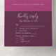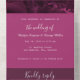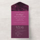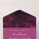 Cette carte d'invitation de mariage tout-en-un est spéciale. Vous obtenez votre carte d'invitation et la carte de réponse RSVP en un seul exemplaire. Vous pouvez personnaliser cette carte d'invitation de mariage moderne et élégante avec votre introduction, vos noms, l'occasion, la date, l'adresse, la réponse RSVP, les repas et d'autres couleurs de fond selon vos préférences. Même l'image est modifiable. Elle présente un mélange harmonieux de tons violets et une typographie blanche qui convient parfaitement. Il s'agit d'un motif de marbre tourbillonnant dans des tons violets et noirs qui ressemble à une rose. Vous pouvez sceller élégamment et envoyer cette invitation de mariage à trois volets économique. Renvoyez la carte postale RSVP détachable à l'expéditeur. Faites de ce design spécial le vôtre et ressentez-vous comme le prince et la princesse de