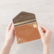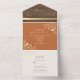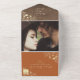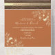 Élégant, boho, moderne, simple faire-part de mariage tout-en-un en terre cuite avec dentelle florale en faux or et photo personnalisée du couple à l'arrière. Ajoutez votre photo, les détails du mariage et rsvp.