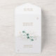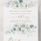 Cette invitation de mariage tout-en-un présente de l'eucalyptus peint à l'aquarelle, des feuilles vertes botaniques et des feuilles de glitter or avec un script or.