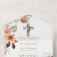 Jolies fleurs de couleur d'eau et un bocal de mason, la croix d'or de cette élégante Faire-part de mariage 3 en 1 qui comprend un rsvp déchiré. Idéal pour un mariage catholique.