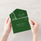 Le bord gauche de cette élégante faire-part de mariage tout-en-un moderne et RSVP est doté d'une bordure d'aquarelle vert chasseur, ornée d'une parties scintillant en faux argent. Le texte personnalisable combine écriture gris argent, copperplate et polices italiques sur un arrière - plan vert. L'adresse de retour apparaît sur le rabat extérieur et sur le côté arrière de la carte RSVP détachable en gris argenté sur vert solide.