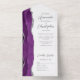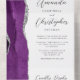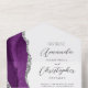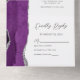 Le bord gauche de cette élégante faire-part de mariage tout-en-un moderne et RSVP est doté d'une bordure d'aquarelle violette ornée d'une parties scintillant en faux argent. Le texte personnalisable combine écriture manuscrite grise au fusain, cuivre et polices italiques sur un arrière - plan blanc. L'adresse de retour apparaît sur le rabat extérieur et sur le côté arrière de la carte RSVP détachable en texte gris fusain sur blanc solide.
