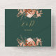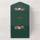 Faire-part de mariage tout-en-un avec fleurs rustiques et élégante typographie or sur un arrière - plan vert émeraude. L'invitation comprend une carte RSVP perforée avec votre code QR du site Web mariage. Conçu par Thisisnotme©