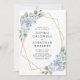 Tout en un QR Code Dusty Blue Floral Gold Cadre géométrique Faire-part de mariage... Notre faire-part de mariage florale bleue "avant et arrière" présente des bouquets de fleurs bleues poussiéreuses sur un cadre géométrique doré bordant votre texte d'invitation personnalisé. Le verso de l'invitation contient tous les détails que vous verriez généralement sur des cartes séparées dans le paquet mariage, y compris le code QR pour votre site mariage — que vous pouvez créer directement sur le modèle de personnalisation de Zazzle. Ce style moderne tout en un faire-part de mariage a été conçu pour être à la fois élégant et soucieux du budget... ainsi que des économies de temps. Tous les exemples de texte des deux côtés peuvent être facilement révisés avec vos propres informations sur le modèle de personnalisation.