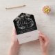 Le tout dans un faire-part de mariage avec de jolies lampes à cordes, une guirlande florale dessinée à la main et une typographie chic sur un arrière - plan noir. L'invitation comprend une carte RSVP perforée avec votre code QR du site Web mariage et des détails. Conçu par Thisisnotme©
