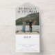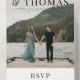 Une superposition de type moderne avec de grands noms et une photo de fond plein sont les caractéristiques sur tout cela dans un seul faire-part de mariage avec la carte de réponse déchiré.