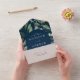 Invitations de mariage tout-en-un, botaniques et modernes, avec des détails mariages nichés à l'intérieur d'un cadre voûté entouré d'eucalyptus, de fougères et d'autres riches espaces verts avec un arrière - plan de marine. Personnalisez le faire-part de mariage tout-en-un de verdure d'aquarelle avec des détails mariages tels que vos noms, date du mariage, informations sur le lieu, date de réponse, choix de repas, etc. Conçu pour coordonner avec notre collection de mariages de verdure Abondante.