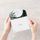 Arcs blancs et roses sur l'arrière - plan en feuille de palme foncé avec monogramme au-dessus de l'arche blanche. Illustrations en feuilles de palmier aquarelle en haut à gauche et en bas à droite sur la carte R.S.V.P. L'extérieur est blanc avec du texte qui inclut l'adresse de retour (rabat supérieur), le script "livrer" (centre) et l'adresse en bas (dos de rsvp).