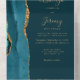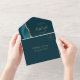 Le bord gauche de cette élégante faire-part de mariage tout-en-un moderne et RSVP est doté d'une bordure turquoise en aquarelle bleue, ornée d'une parties scintillant en faux or. Le texte personnalisable combine écriture manuscrite fantaisie couleur or, polices cuivre et italique sur un arrière - plan bleu turquoise foncé. L'adresse de retour apparaît sur le rabat extérieur et sur le côté arrière de la carte RSVP détachable en texte doré sur turquoise solide.