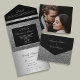 Faites une déclaration audacieuse et élégante avec ce faire-part de mariage noir et argent. Avec des détails de parties scintillant en faux argent, des panneaux noirs classiques et un rabat d'enveloppe assorti, cette invitation tout-en-un comprend de l'espace pour vos infos mariage, la section RSVP, et même une photo du couple. Idéal pour les mariages modernes, hivernaux ou glamour. Important : Cette invitation tout-en-un nécessite une enveloppe distincte pour l'envoi.
