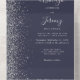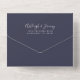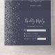 Le bord gauche de cette élégante faire-part de mariage tout-en-un moderne et RSVP présente une bordure en faux parties scintillant argentée. Le texte personnalisable combine écriture lunatique gris argent, copperplate et polices italiques sur un arrière - plan bleu foncé. L'adresse de retour apparaît sur le rabat extérieur et sur le côté arrière de la carte RSVP détachable en gris argenté sur bleu foncé solide.
