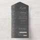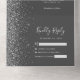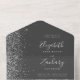 Le bord gauche de cette élégante faire-part de mariage tout-en-un moderne et RSVP présente une bordure en faux parties scintillant argentée. Le texte personnalisable combine écriture lunatique gris argenté, cuivre et polices italiques sur un arrière - plan gris fusain. L'adresse de retour apparaît sur le rabat extérieur et sur le côté arrière de la carte RSVP détachable en gris argenté sur gris-fusain solide.