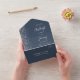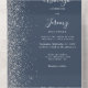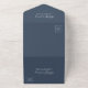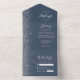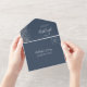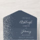 Le bord gauche de cette élégante faire-part de mariage tout-en-un moderne et RSVP présente une bordure en faux parties scintillant argentée. Le texte personnalisable combine écriture blanche fantaisie, cuivre et polices italiques sur un arrière - plan bleu indigo. L'adresse de retour apparaît sur le rabat extérieur et sur le côté arrière de la carte RSVP détachable en texte blanc sur indigo solide.