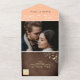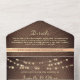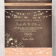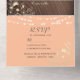 Elégant, boho, moderne, chic chic de pêche fuzz et mariage en bois rustique invitation tout-en-un avec la dentelle florale en faux or, les lumières à cordes et image personnalisée du couple à l'arrière. Ajoutez votre photo, les détails du mariage et rsvp.