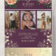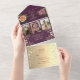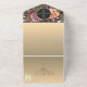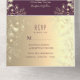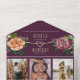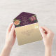 Elégant, moderne, moody romantique, faire-part de mariage tout-en-un fleuri et pourpre avec dentelle dorée, fleurs d'aquarelle et 3 photos du couple. Ajoutez vos photos, détails mariages et rsvp.
