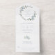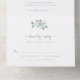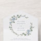 Mariage élégant tout en une invitation. Elégante et romantique, la suite Mariage Floral bleu Dusty présente une magnifique aquarelle peinte à la main bleu poussiéreux, des roses crème et des feuilles verts sauge disposés comme une couronne élégante. Trouvez les articles correspondants dans la suite Mariage Dusty Blue Wreaths.