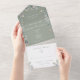 Faire-part de mariage tout-en-un avec un beau feuillage de verdure aquarelle et une typographie moderne élégante sur fond vert sauge. L'invitation comprend une carte RSVP perforée qui peut être adressée individuellement ou laissée en blanc pour que vous puissiez écrire à la main les coordonnées de vos invités. Conçu par Thisisnotme©