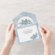 Fleurs d'aquarelle de cactus bleu roux avec bleu feuille floral tout en un mariage de automne Invitation. Cet élégant design présente un cadre en arc et des fleurs de cactus couleur bleu poussiéreux aux feuilles succulents et autour il y a un arrière - plan d'aquarelle bleu. La carte RSVP peut être détachée.