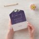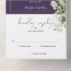 Invitation de mariage tout-en-un avec feuillage botanique rustique tombant sur un arc doré entourant une typographie élégante sur fond violet. L'invitation comprend une carte RSVP perforée qui peut être adressée individuellement ou laissée vierge pour que vous puissiez écrire à la main les coordonnées de vos invités. Conçue par Thisisnotme©