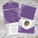 Célébrez une romance intemporelle avec ce faire-part de mariage tout en un d'inspiration vintage, doté d'un riche arrière - plan violet et d'une dentelle florale moderne blanc-argenté. Élégant et enchanteur, ce design allie charme vintage et sophistication moderne, idéal pour les mariages romantiques, boho ou classiques. Customisez avec votre photo préférée et vos initiales monographiques pour en faire la vôtre. Inclut de l'espace pour votre site Web mariage et les détails RSVP, ce qui le rend aussi pratique que beau. Une façon chic et inoubliable de partager votre histoire d'amour. Remarque : Cette invitation tout-en-un nécessite une enveloppe distincte pour l'envoi. Nous vous recommandons de l'apparier avec une enveloppe A9 standard (5,75 po x 8,75 po) pour un meilleur ajustement.